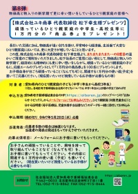 この度、株式会社ユキ商事 代表取締役 松下幸生様より、またまたまたまた・・の8度目の温かいご厚意のご寄附をいただきました。松下社長のご意思に近い形として、物価高と物入りの新学期で、経済的にも精神的にも更に辛い想いをしながら、頑張っているひとり親家庭の子どもに、応援エールのプレゼントとして『1万円分の商品券』を100名にプレゼントします。