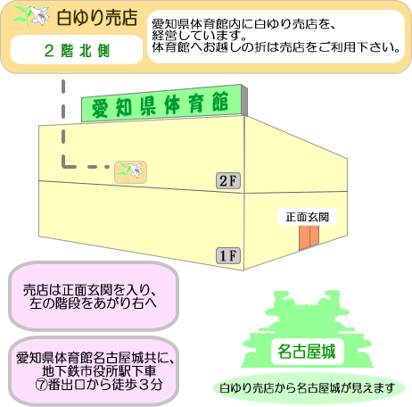 - 愛知県体育館に、白ゆり売店を設置しています。令和元年度は大相撲名古屋場所を中心に、23日営業しました。